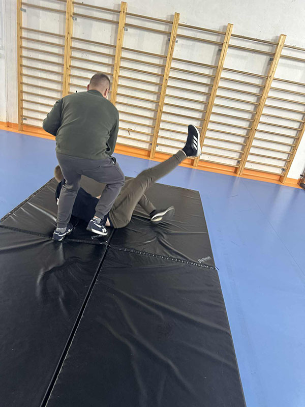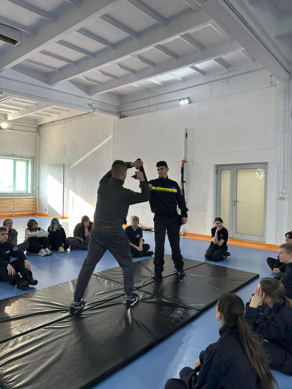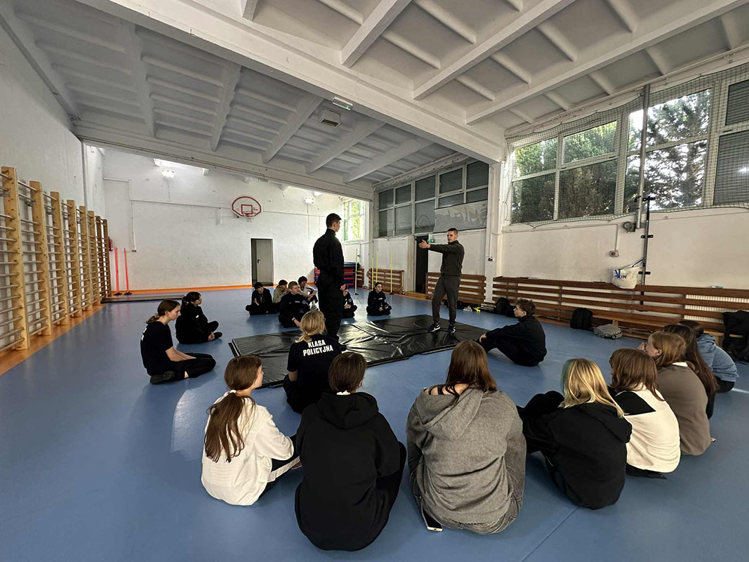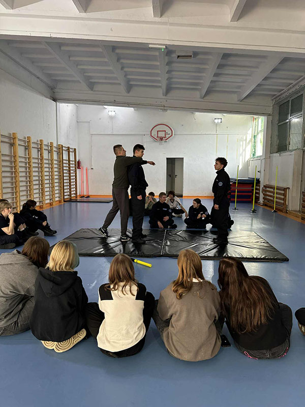 Prawdziwą atrakcją był pokaz podstawowych technik samoobrony, który wzbudził wiele emocji i zachęcił do aktywnego udziału. Funkcjonariusz zaprezentował, jak w sytuacjach zagrożenia można skutecznie chronić siebie i innych, wykorzystując proste, ale efektywne ruchy. Uczniowie mieli okazję spróbować swoich sił pod okiem profesjonalisty, co z pewnością pozostanie w ich pamięci na długo.