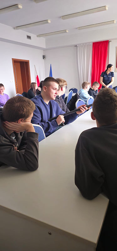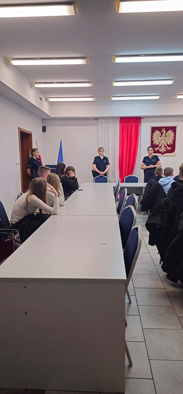 👩👧 Rozmowa z policjantkami z Wydziału ds. Nieletnich Uczniowie spotkali się także z policjantkami zajmującymi się sprawami nieletnich. Funkcjonariuszki opowiedziały o swojej codziennej pracy, wyzwaniach związanych z pomocą młodym ludziom oraz działaniach profilaktycznych prowadzonych w szkołach i środowisku lokalnym. Podkreśliły, jak ważna jest współpraca policji z nauczycielami, rodzicami i instytucjami wspierającymi młodzież.